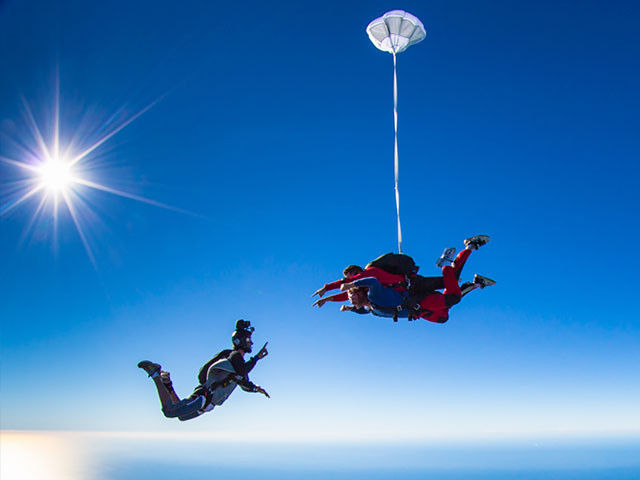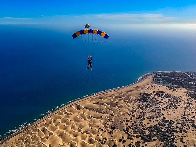 iJump Gran Canaria te ofrece una experiencia única de salto en paracaídas a 10.000 pies de altura, (3.300 metros sobre el nivel del mar) acompañado por un instructor que te acompañará desde el emocionante vuelo, la caída a 200 km/h y el descenso en paracaídas hasta el aterrizaje en las suaves arenas de Playa El Inglés