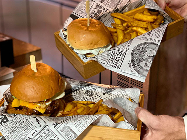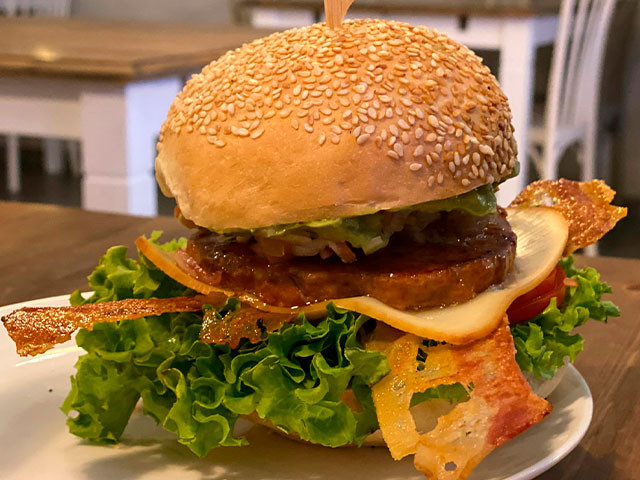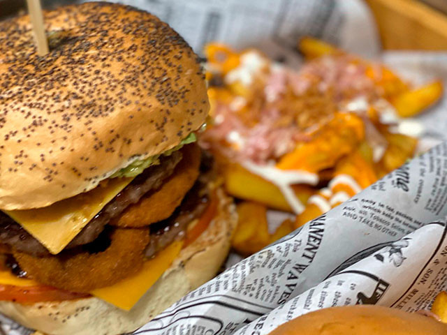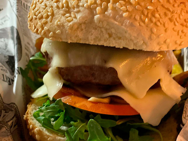 Cheese Burger: Burger de vaca 100% en un pan con semillas de amapola, un toque crujiente de bacon, cheddar y gouda, junto a tomate y lechuga fresca