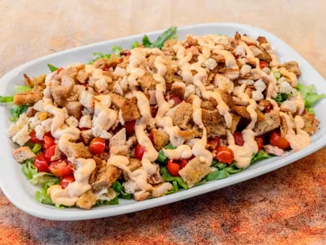 Ensalada Sesarpo (Cuartonesa + atún, lechuga romana, cherrys, pollo empanado, crutones)