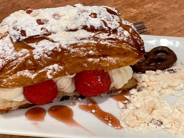 Milhoja de nata y fresas con tierra de merengue y galleta de chocolate