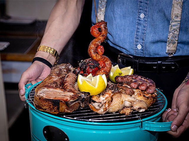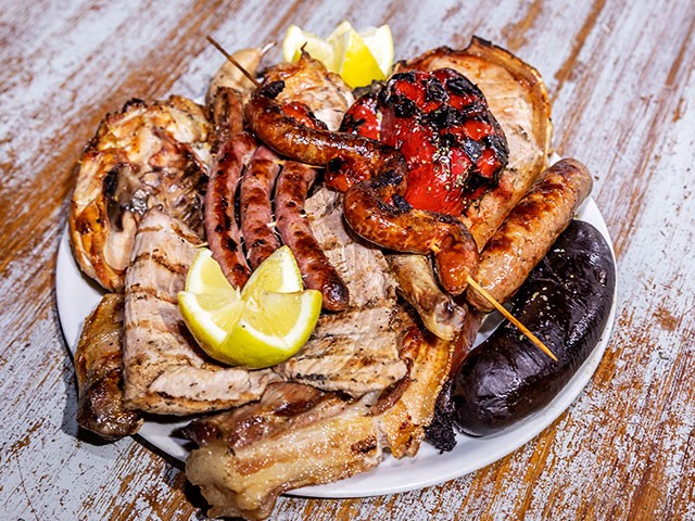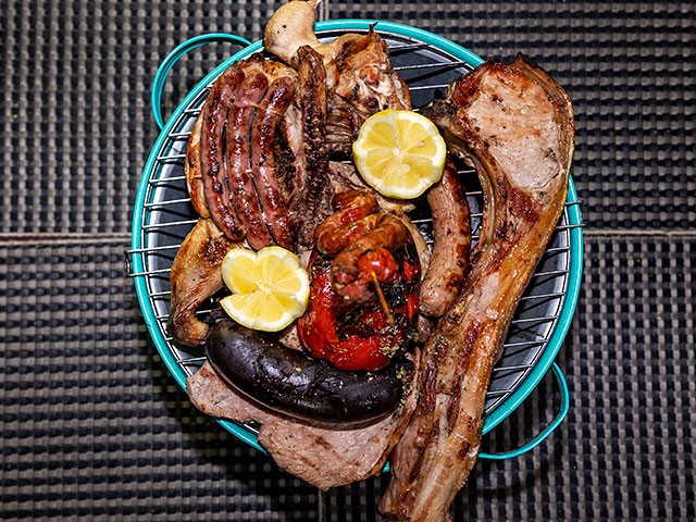 Parrillada de carne con chuleta de cerdo, pollo asado, bistec de cerdo, pimientos y papas naturales