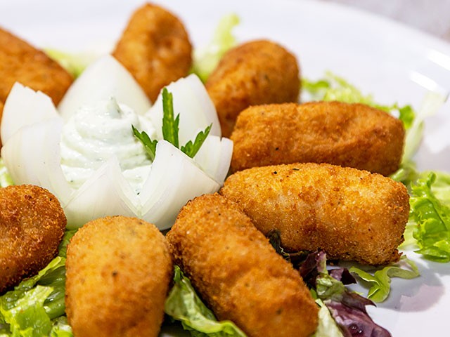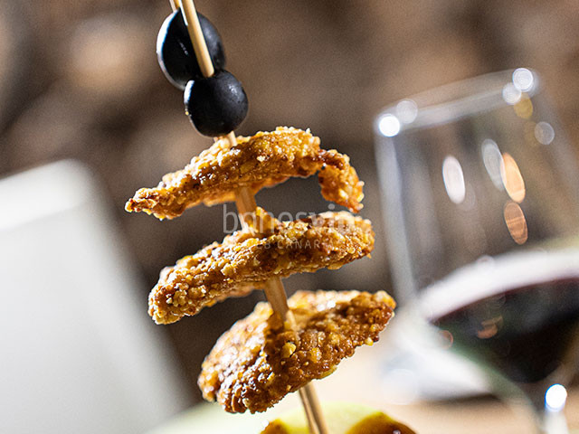 Croquetas de morcilla con frutos secos y piña con salsa de arándanos