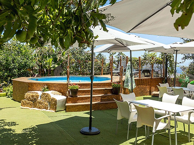 En la fachada de la casa, podrás acceder por medio de una escalera adosada a un estanque que ocupa la superficie del patio. En la fachada norte, se abre una gran puerta que permite la comunicación directa de la casa con el Camino La Raya.