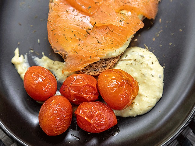 Tostada de semillas con salmón marinado, muselina de aguacate y tomatitos cherrys asados
