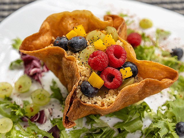 Ensalada de Cous Cous con frutas y dados de queso fresco sobre cesta crujiente de tortilla de maíz