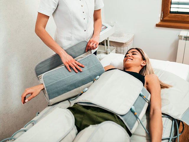 La presoterapia: El equipo que se utiliza, combina tres funciones para mayor efectividad: Presoterapia por aire a presión (drenaje linfático), electroestimulación (gimnasia pasiva), infrarrojos efecto sauna (termoterapia) con infrarrojos