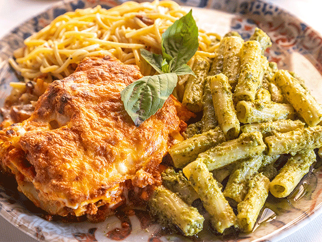 Tris de Pasta (Selección de tres pastas: Maccheroni al Pesto, Spaghetti a la Carbonara y Lasagna de carne)