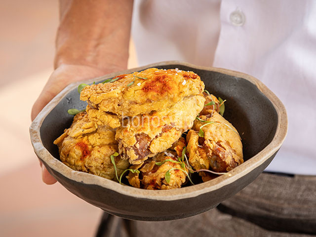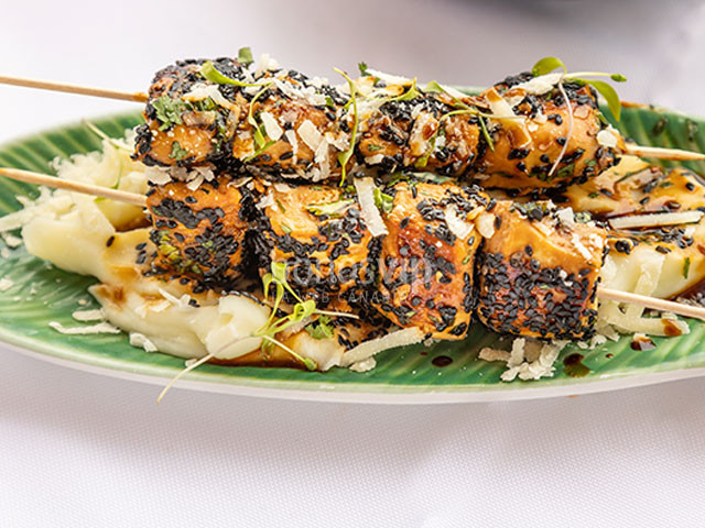 2 Brochetas de pollo con parmesano y cremoso de papas