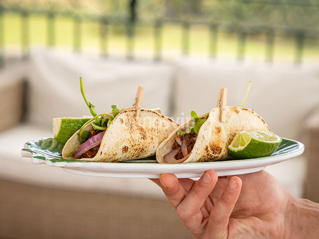 2 Taco con carne estofada, cebolla encurtida y pimientos de padrón