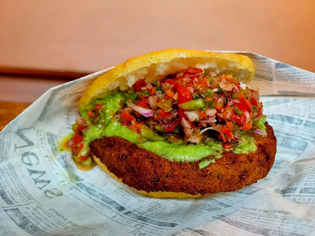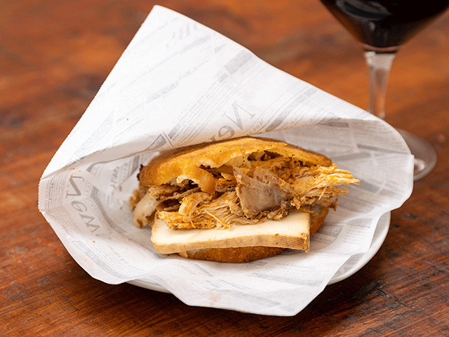 Maracucha de carne: queso ahumado, pantano frito y carne mechada