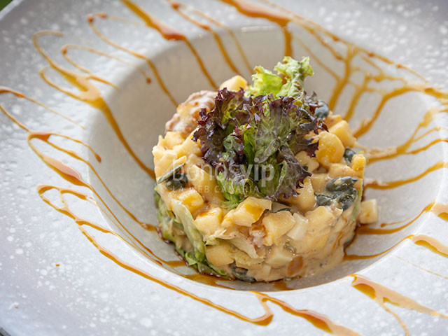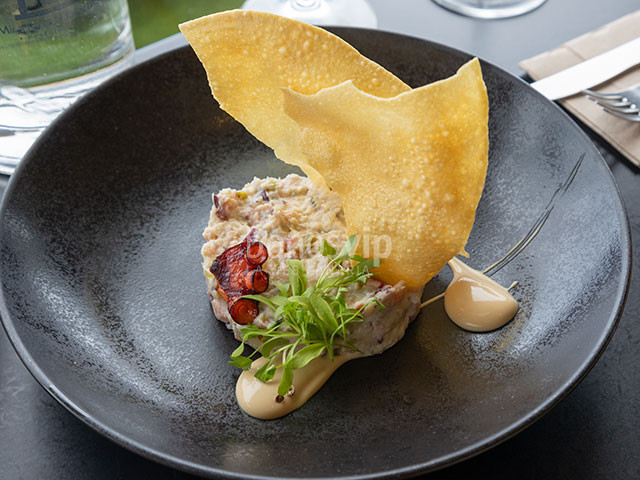 Ensaladilla de batata, pulpo y encurtidos con su salsa especial