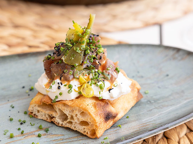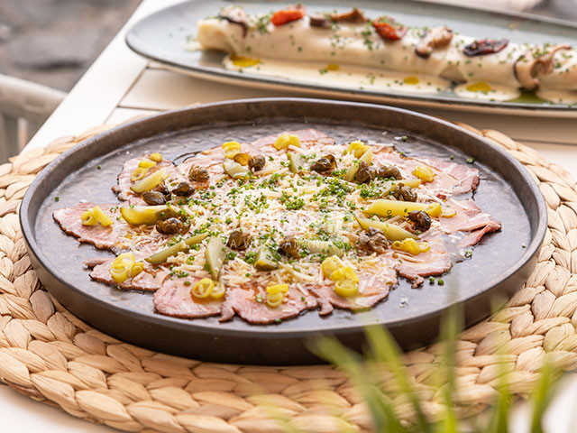 Carpaccio de Presa Ibérica: Finas láminas de presa ibérica marinada en aceite de oliva virgen extra y especias, complementadas con rúcula fresca y lascas de queso parmesano