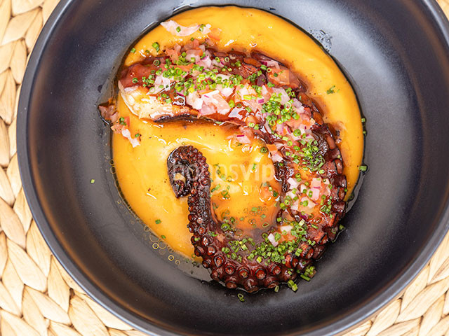 Pulpo con Puré de Papa Negra: Pulpo a la parrilla servido sobre un suave puré de papa negra, que resalta su sabor único y su textura delicada
