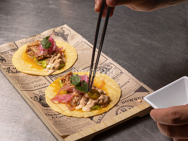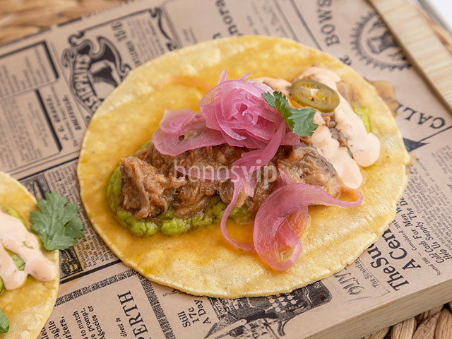 Tacos de Costilla: Tiernas costillas de cerdo marinadas y desmenuzadas, envueltas en tortillas suaves con un toque picante y acompañadas de guarniciones frescas