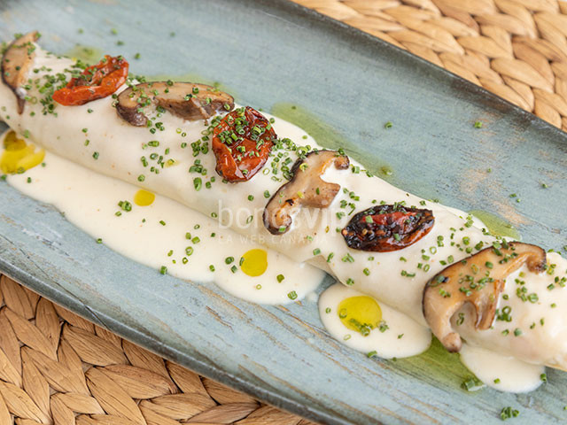 Canelón de Setas: Delicadamente relleno con una mezcla aromática de setas frescas y gratinado con queso parmesano