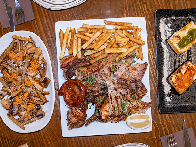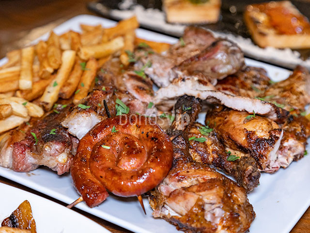 Parrillada de carne: Bistec, chuleta, pollo asado, chistorras... Acompañado de papas fritas