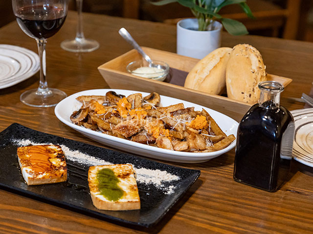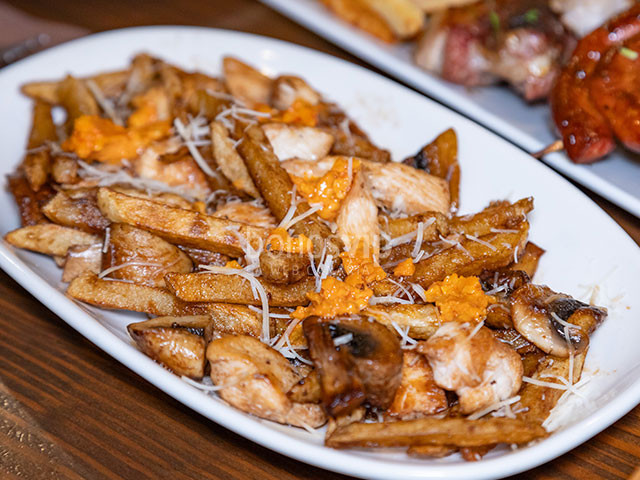 Salteado la parrilla: Champiñones frescos salteados con papas, pechuga de pollo, cebolla, queso, soja, semillas de sésamo y almogrote