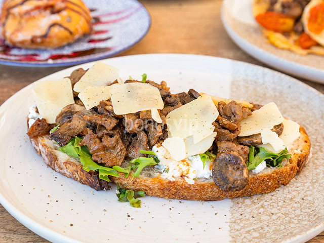 Tosta de Navarra: Ricotta, canónigos, rúcula, finas láminas de Ternera, chimichurri y láminas de parmesano