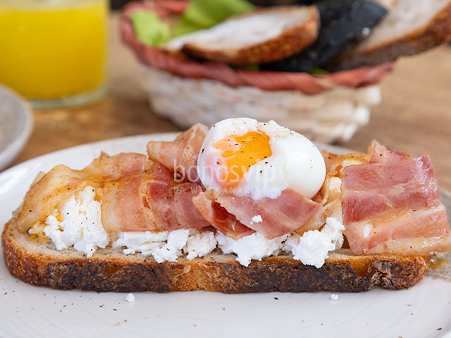 Tosta de Oviedo: Ricotta, bacon, huevo poché o escalfado con toque de salsa dulce