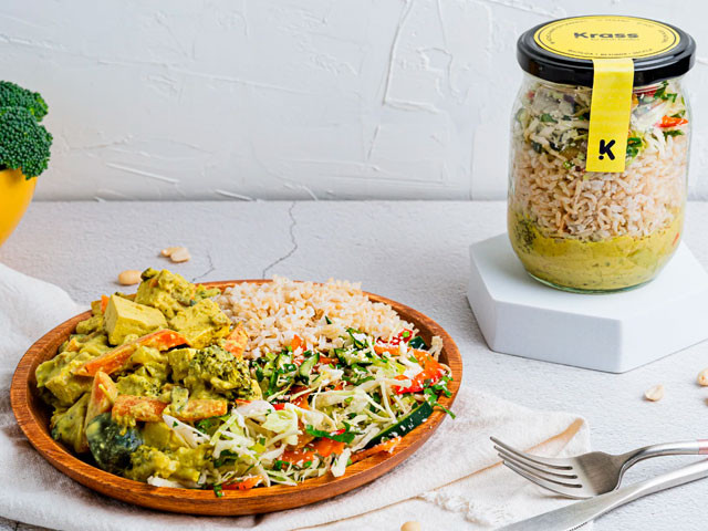 ANDAMÁN: Una receta inspirada en el sudeste asiático. Curry verde de verduras y tofu, con leche de coco y aromas de lima kaffir, arroz de grano largo integral, ensalada de col, zuchinni y pimiento aderezada con cilantro y coco, rematada con una irresistible salsa de cacahuete