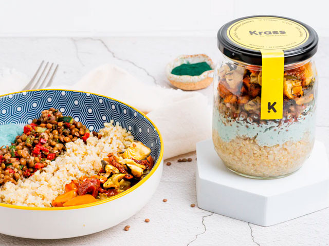 KIKA: Uno de los tarros más proteicos. Quinoa salteada con ajitos, salsa de yogur de soja con espirulina, ensalada de lenteja pardina con con alga Kombu, pimiento rojo, cebolla, AOVE y mejorana y verduras al horno con aliño de limón, tomate seco y tomillo