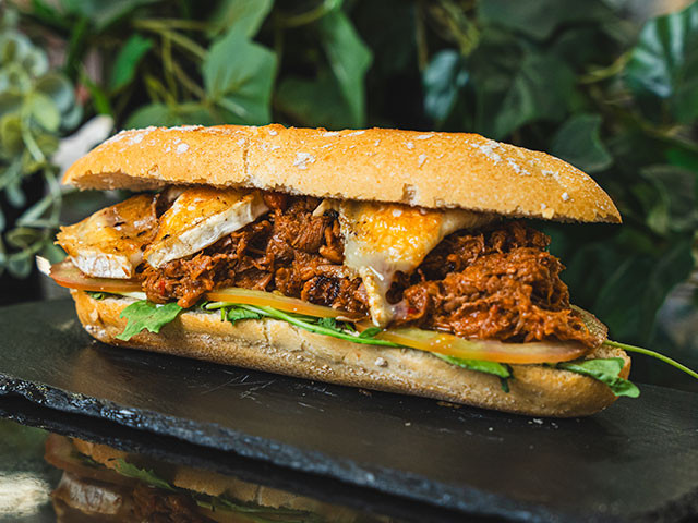 Mecherito: carne mechada, rulo de cabra, brotes verdes y tomate