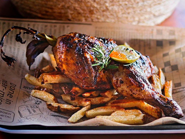 Pollo marinado con limón, romero y verduras a la parilla
