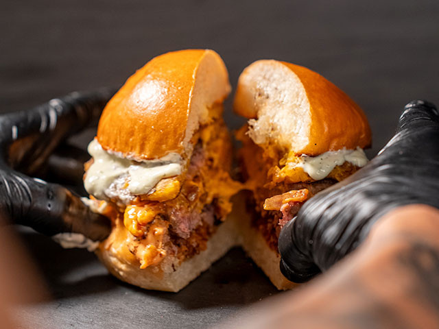 Bomba de Cheddar (carne, salsa cheddar, queso cheddar, pepinillos, salsa de pimientos ahumados, tiras de bacon y cebolla frita)
