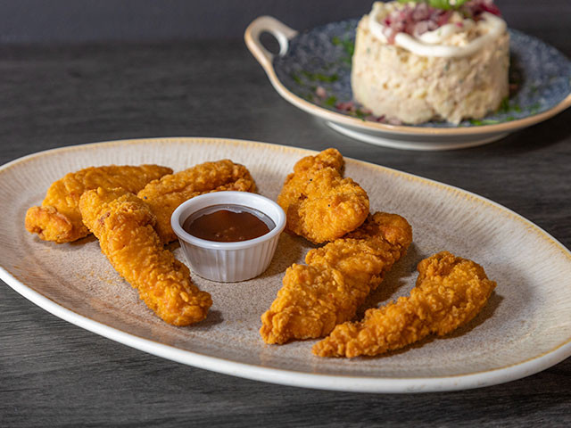 Chicken and Bacon (pollo crujiente, tiras de bacon, salsa de bacon y ensalada de col)