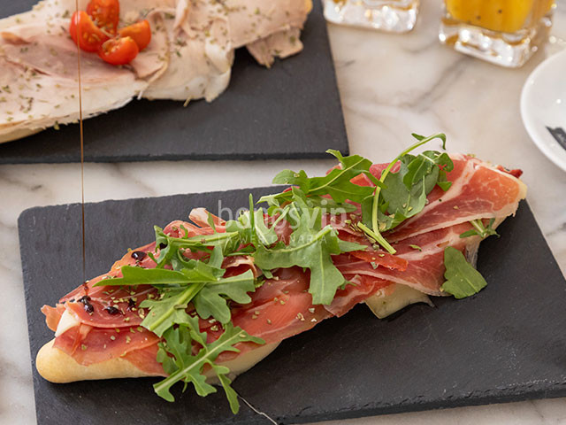 Tosta con tumaca, jamón serrano, queso semicurado, rúcula, orégano y vinagre balsámico