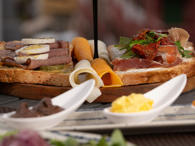 2 tostas a elegir: con pepinillo, pastrami y mostaza o Tosta con queso crema, tomate deshidratado, serrano y albahaca