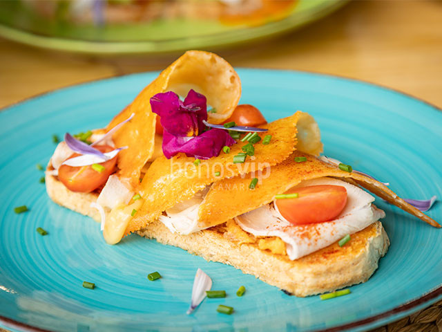 Pata asada aliñada con queso a la plancha, almogrote y miel de flores