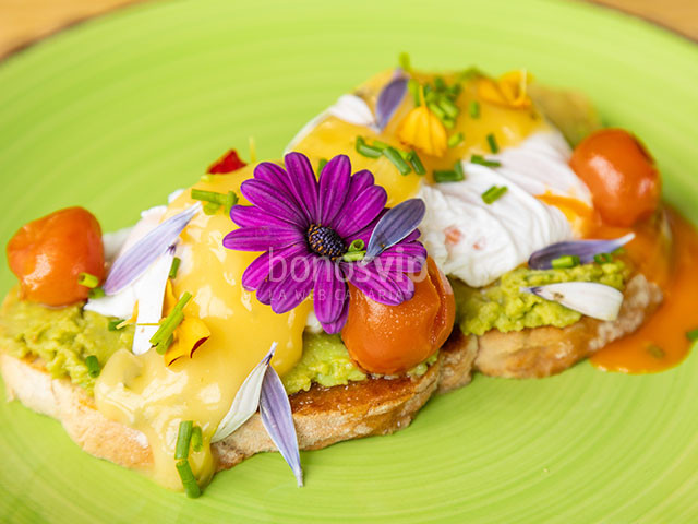 Crema de aguacate espaciada con huevo pochado trufado y salsa bearnesa