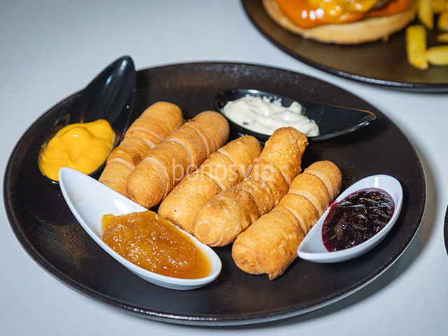 Tequeños Guachincheros: palitos de masa crujiente rellenos de queso mozzarella, servidos con una cremosa salsa de ajo y un mojo suave para dipear
