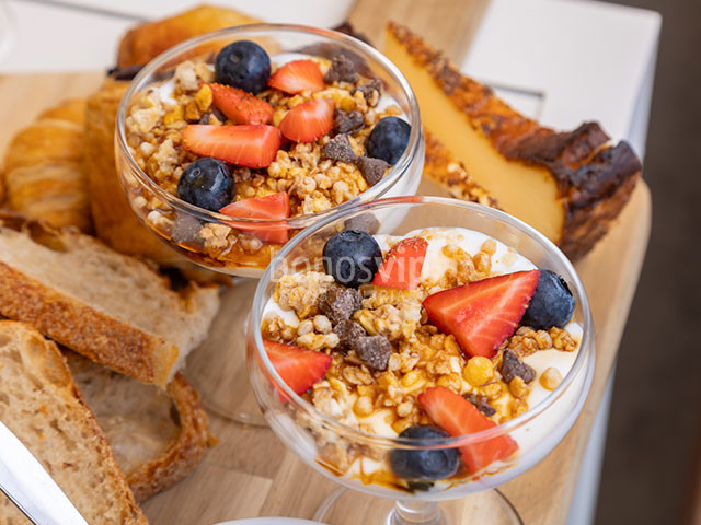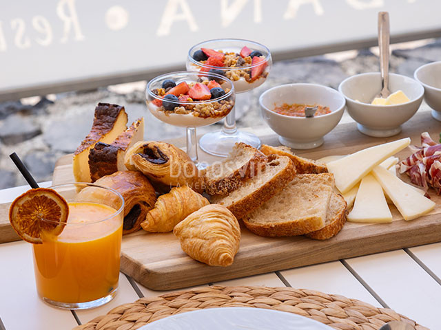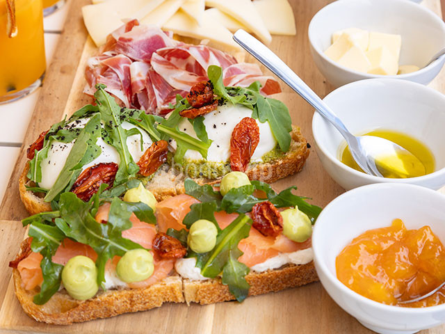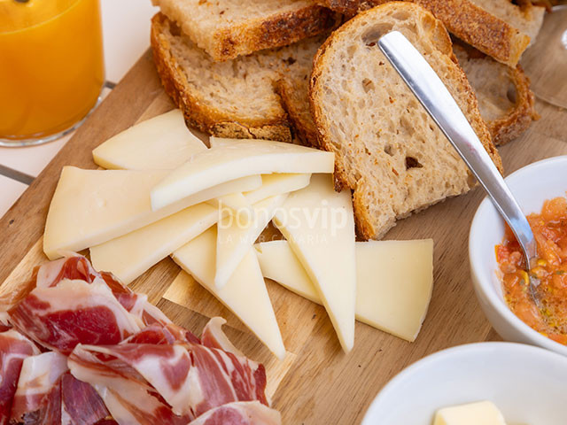 Panadería con mantequilla, mermeladas, tomate rallado y AOVE