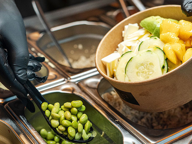Pollo: pollo, mango, pepino, edamame, aguacate, crunchy mix y nuestra salsa chili-mango (ligeramente picante)