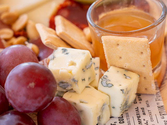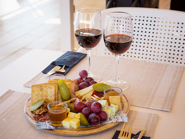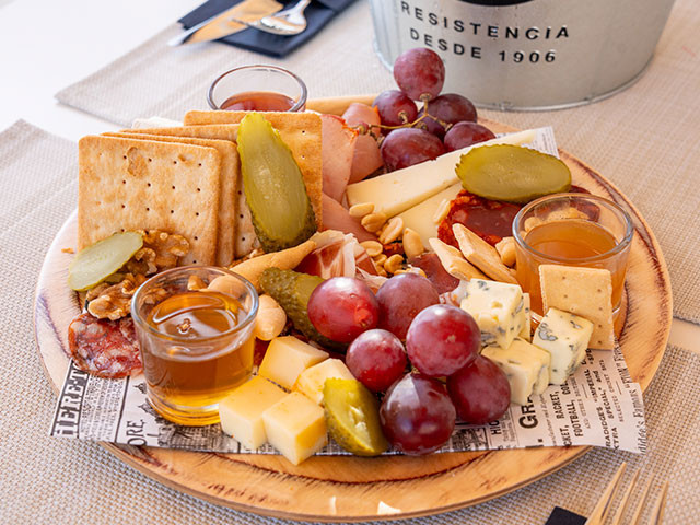 Tabla de ibéricos con jamón serrano, chorizo ibérico, salchichón ibérico, lomo embuchado, queso manchego, queso brie, queso canario, queso azul, nueces y cacahuetes, mermeladas canarias, miel, galletas, panes secos, pepinillos y uvas