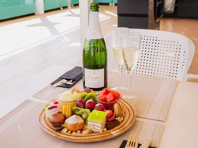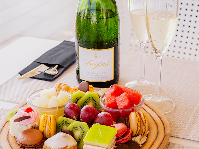 Tabla con macarons surtidos, fruta de temporada y mini pasteles variados