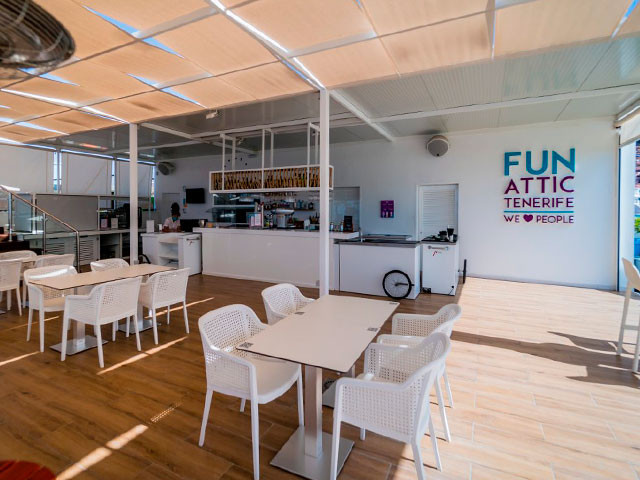 FunAttic Gastrobar es un espacio de diversos ambientes en el rooftop del Hotel Paradise Park, en Los Cristianos. Una zona versátil solo para adultos (+18) que te permitirá disfrutar de un espacio de relax rodeado de vegetación y con las mejores vistas de la costa de Tenerife Sur. Cuenta con rincón chill out, cocktail station y restaurante
