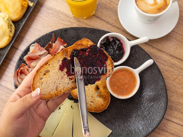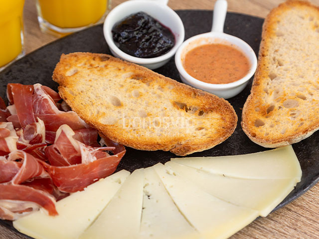 Tabla variada con: 2 tostas de masa madre, jamón ibérico, queso manchego, tumaca y mermelada
