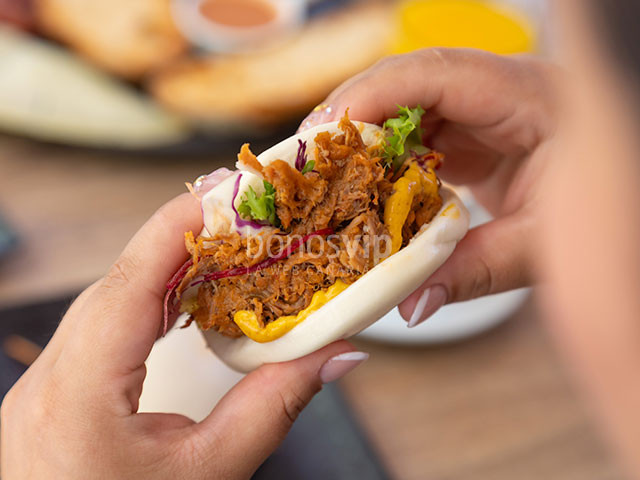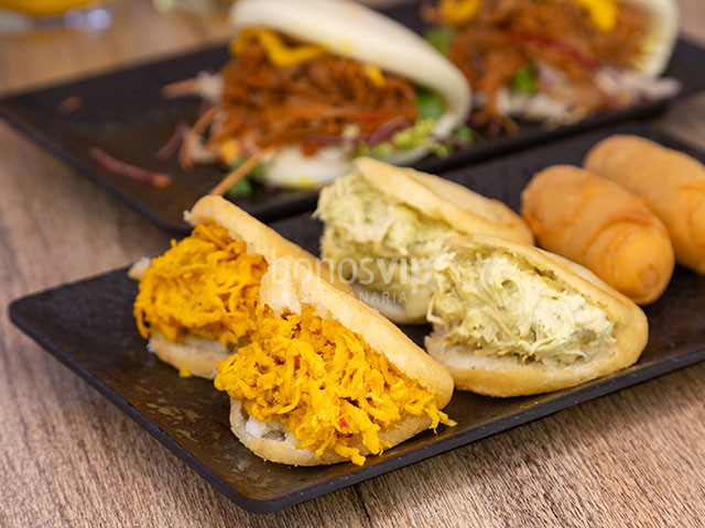 2 Baos con carne mechada ensalada, salsa chilli y salsa curry de mango