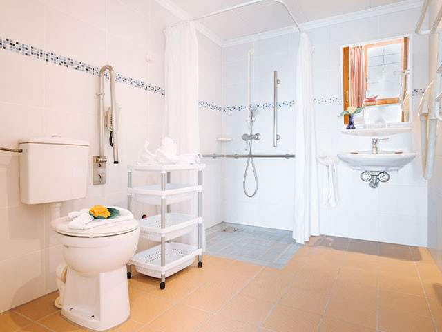 Este alojamiento cuenta con sala de estar y dormitorio independientes, baño accesible y balcón o terraza con mobiliario de jardín. La sala está equipada con cocina americana (dos placas de cocción y nevera), sofá cama individual con cama extraíble, aparador, mesa de centro con sillón de mimbre y mesa de comedor con sillas. El dormitorio dispone de dos camas individuales (50 cm de altura), mesillas de noche, cómoda y armario empotrado. No dispone de aire acondicionado, pero sí dispone de ventilador. El baño es accesible para silla de ruedas, algunos incluyen inodoro elevado, asideros, secador de pelo, ducha adaptada y cajonera para accesorios