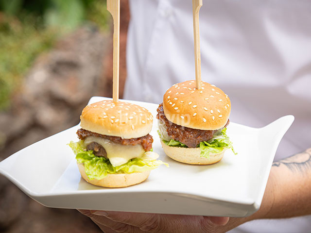 2 mini hamburguesas con queso cheddar, mermelada de bacon y lechuga