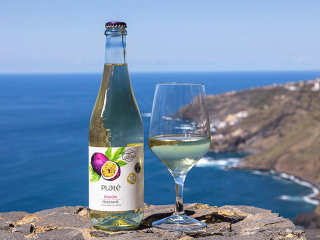 Vino Platé Pasión: espumoso de maracuyá y plátano local de bodegas Platé en El Sauzal