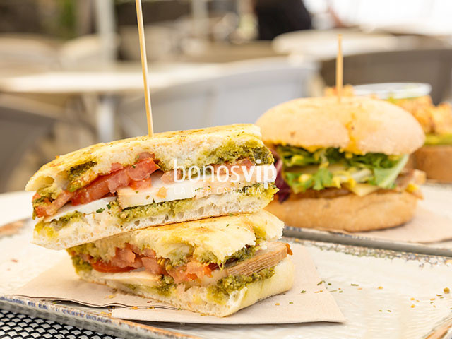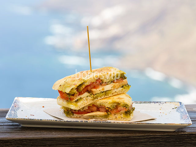 Focaccia Romana: Con pesto fresco, tomate y queso canario ahumado
