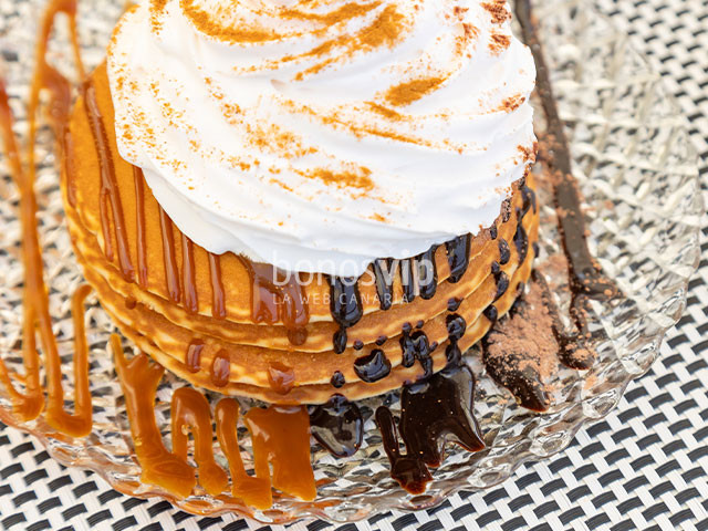 Tortitas de vainilla a elegir con chocolate o dulce de leche y nata montada