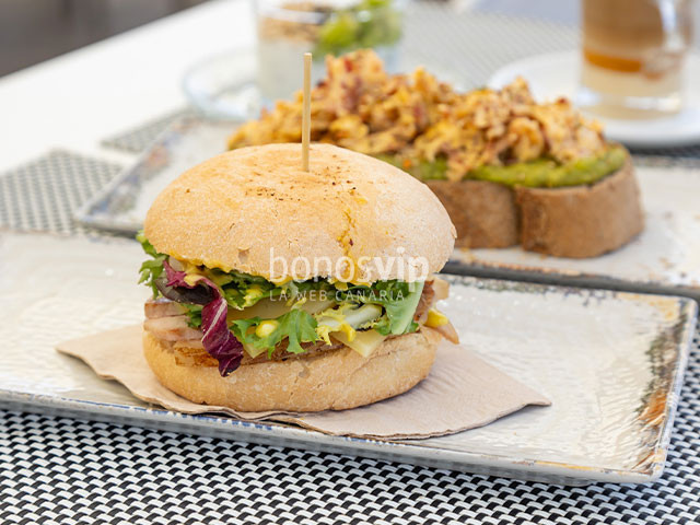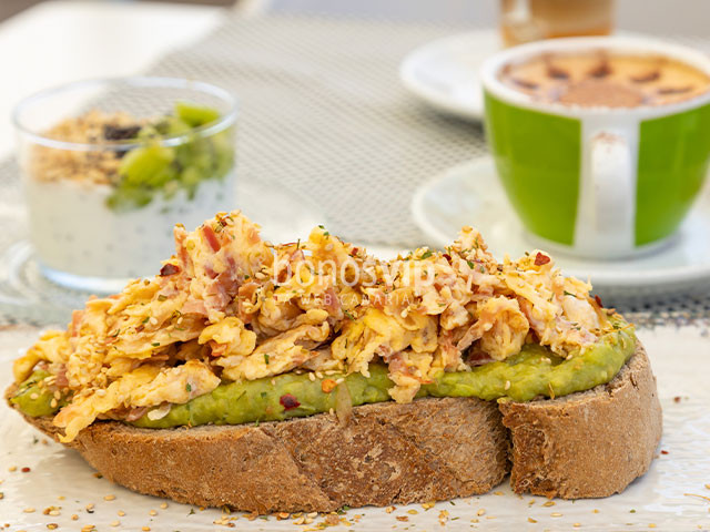 Tosta Delicia: Con Crema de aguacate y revuelto de jamón serrano con cebolla caramelizada