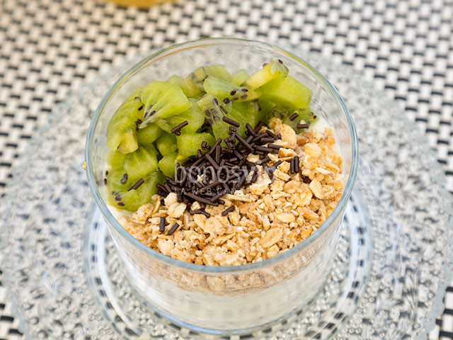 Yogur de coco con semillas de chía, kiwi, muesli de avena y fruta